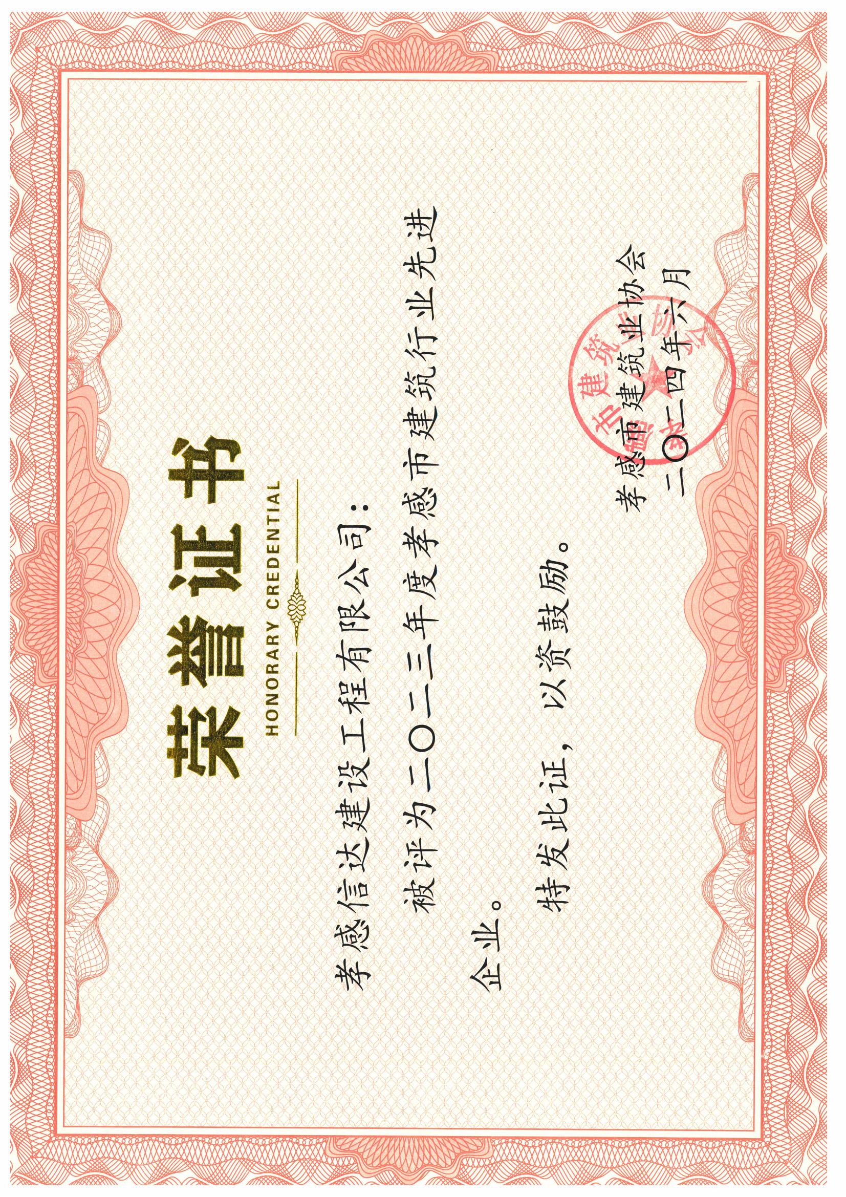 2023年度孝感市建筑行業(yè)先進(jìn)企業(yè)祝賀孝感信達(dá)建設(shè)工程有限公司榮獲2023年度孝感市建筑行業(yè)先進(jìn)企業(yè)榮譽...